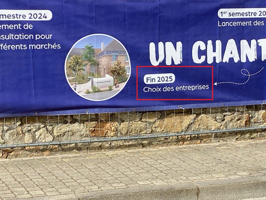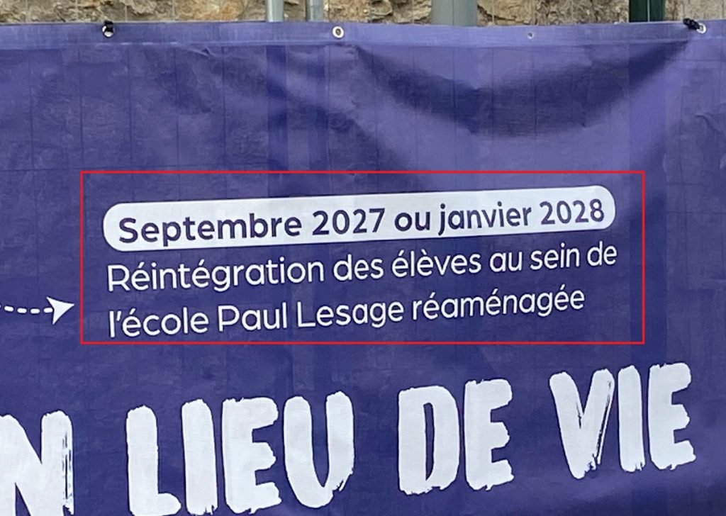 Sur cette même banderole : « Septembre 2027 ou janvier 2028. Réintégration des élèves de l’école Paul Lesage réaménagée ».