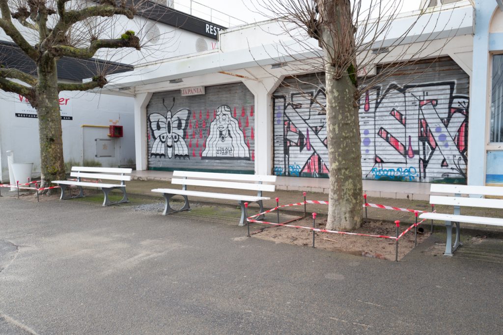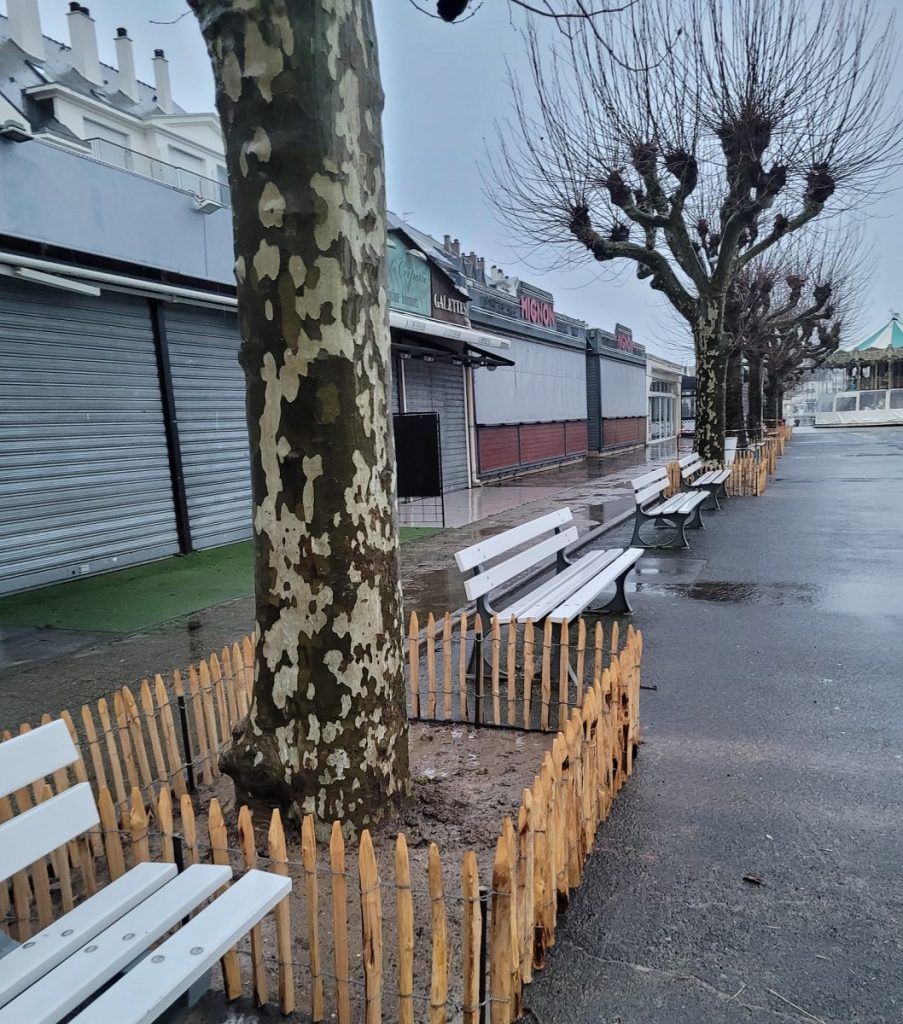 • L’alignement des bancs entre les arbres ceinturés de barrières, les lampadaires et les poubelles, laisse par endroits, peu de place pour traverser des commerces à la promenage. Les exploitants ont-ils été consultés ?